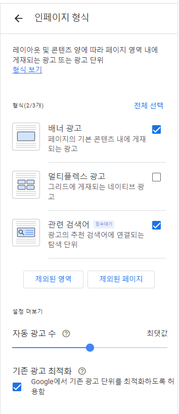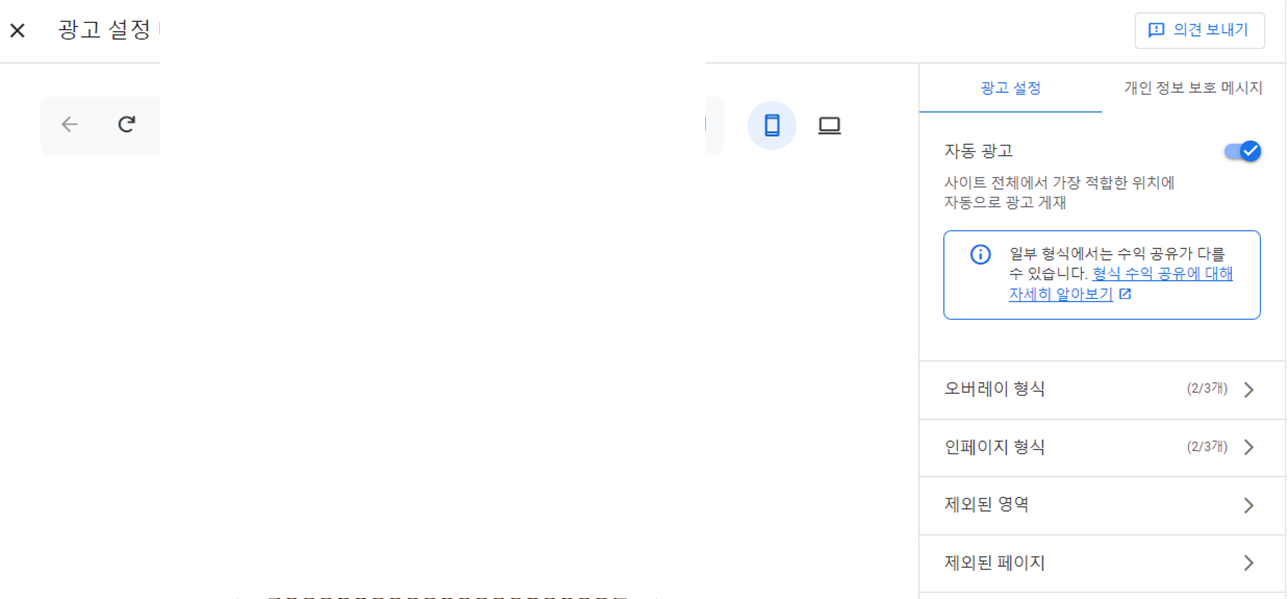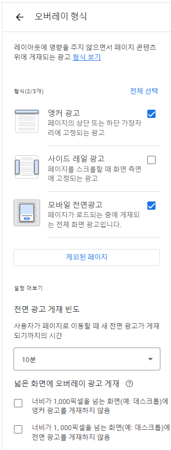 이 곳에서 오버레이 형식의 광고와 인페이지 형식의 광고를 설정할 수 있고, 아예 자동 광고를 끌 수도 있습니다.