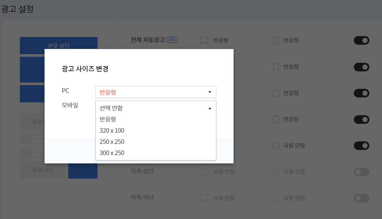 먼저 전체 자동광고를 킬 수 있고, 세부적으로 본문상단, 본문 중간, 본문 하단, 사이드바, 목록 상/하단 등 광고 위치에 대한 설정이 가능합니다.