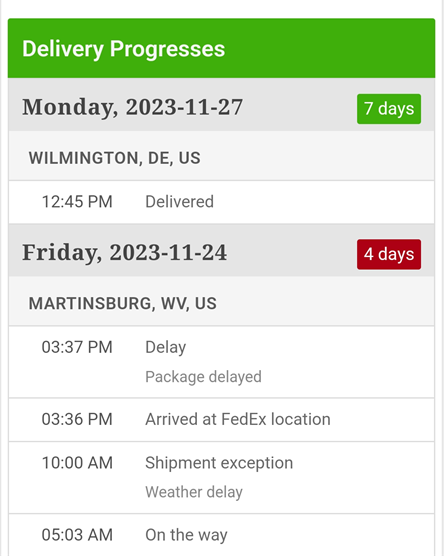 즉 토요일이나 일요일에 배송을 하러 가거나 저의 경우에는 Weather delay로 뜨는데요. 날씨로 인하여 배송을 하지 못했다고 합니다.