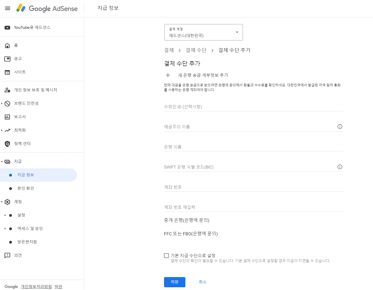 애드센스의 지급 - 지급정보에서 추가하면 되는데요.